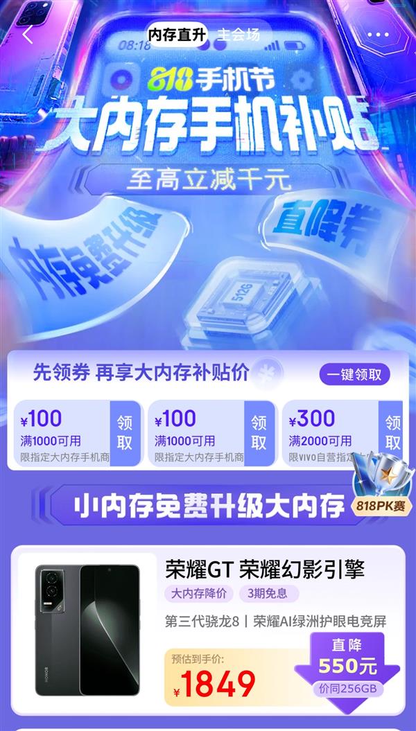 一打开相机就卡顿,想安装新游戏却没空间,甚至打字都要“转圈圈”,手机内存告急,“内存焦虑”成为如今不少年轻人的用机痛点。毕竟珍贵照片和资料删了舍不得,存又没地方,最重要的是想换大内存,价格又劝退。为解决这一难题,京东818手机节特别推出“内存直升”专场活动,内存升级,价格直降!即日起至8月18日,来京东APP搜索“818手机节”,享多款大内存机型至高立减千元,更有分期免息、国家补贴15%、以旧换新至高补贴1500元等多重福利。来京东换新机,享“内存自由”!下面就来看看哪些产品值得入手吧。