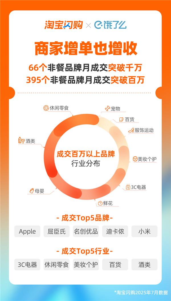 最新数据显示,有395个非餐品牌商家在淘宝闪购月成交突破百万、66个品牌破千万,范围覆盖3C数码、美妆个护、运动户外、服饰、百货、母婴、宠物等多个品类。Apple、小米、屈臣氏、迪卡侬、MO&Co、名创优品等著名品牌都在淘宝闪购实现增单增收。