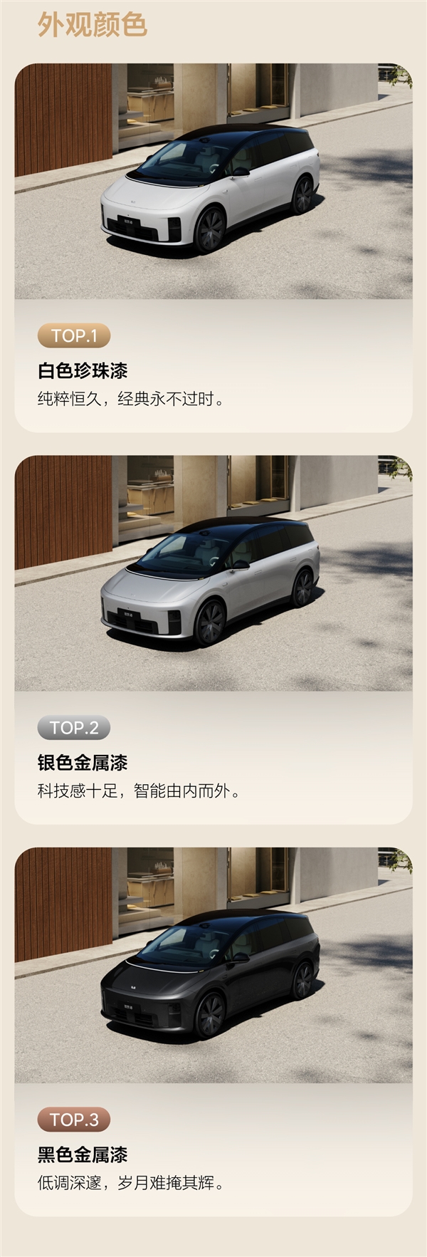 车辆外观配色方面,选择人数最多的前三名分别为白色珍珠漆、银色金属漆和黑色金属漆。内饰配色前三名为灰棕色内饰、白色内饰、黄橙色内饰。