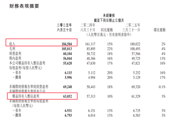财报显示,该季度腾讯实现营收1845亿元,同比增长15%;权益持有人应占利润556亿元,同比增长17%;非国际财务报告准则下,权益持有人应占利润631亿元,同比增长10%。