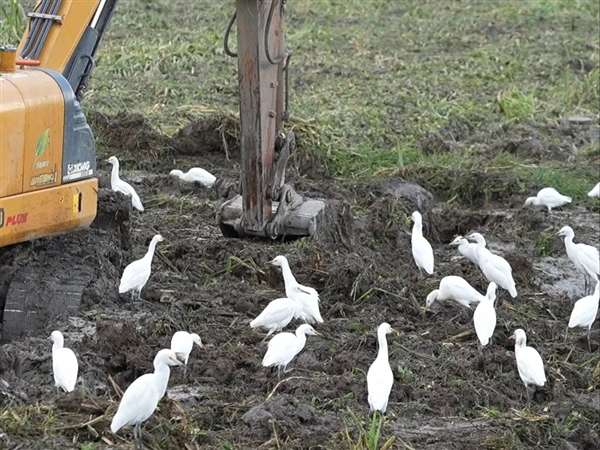 它们跟着挖掘机是去吃那些受到惊吓的昆虫、青蛙等小动物,以及被翻起来的无脊椎动物和昆虫幼虫。