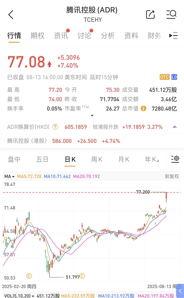 在这其中,腾讯控股ADR表现尤为亮眼,涨幅飙升至7.4%,成功创下逾四年以来的新高。