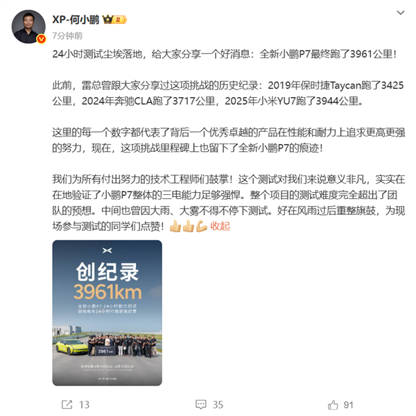 何小鹏称,此前,雷总曾跟大家分享过这项挑战的历史纪录:2019年保时捷Taycan跑了3425公里,2024年奔驰CLA跑了3717公里,2025年小米YU7跑了3944公里。