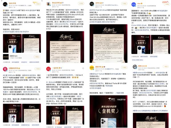 近日,京东818手机节活动火热进行中,由京东发起并主办的818手机节“金机奖”评选结果也正式揭晓。根据京东用户评价与投票,包括华为、红魔、iQOO、联想moto、魅族、努比亚、OPPO、realme、荣耀、三星、vivo、小米、一加、Apple在内共计14款手机脱颖而出。这些获奖产品不仅是各品牌的旗舰爆款,更是消费者心中的优选之作,它们在性能、影像、电竞、外观设计等多个维度各展所长。随着京东818手机节“金机奖”结果出炉,众多获奖厂商更是纷纷在社交媒体平台发表致用户的感谢信。下面就让我们一起来看看。