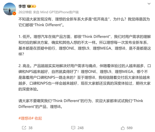 8月15日消息,理想汽车CEO李想发文表示:不知道大家发现没有,理想的全新车系大多是“低开高走”,为什么?我觉得是因为它们都很“Think Different”(非同凡响)。