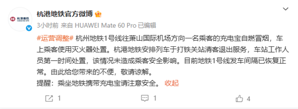 公告称,杭州地铁1号线往萧山国际机场方向一名乘客的充电宝自燃冒烟,车上乘客使用灭火器处置。
