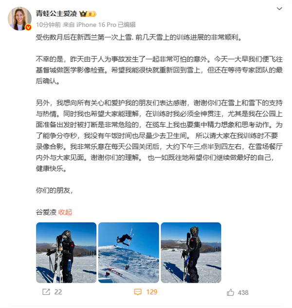 据了解,这是谷爱凌受伤数月后在新西兰第一次上雪。前几天雪上的训练进展的非常顺利,没想到昨天发生了意外。