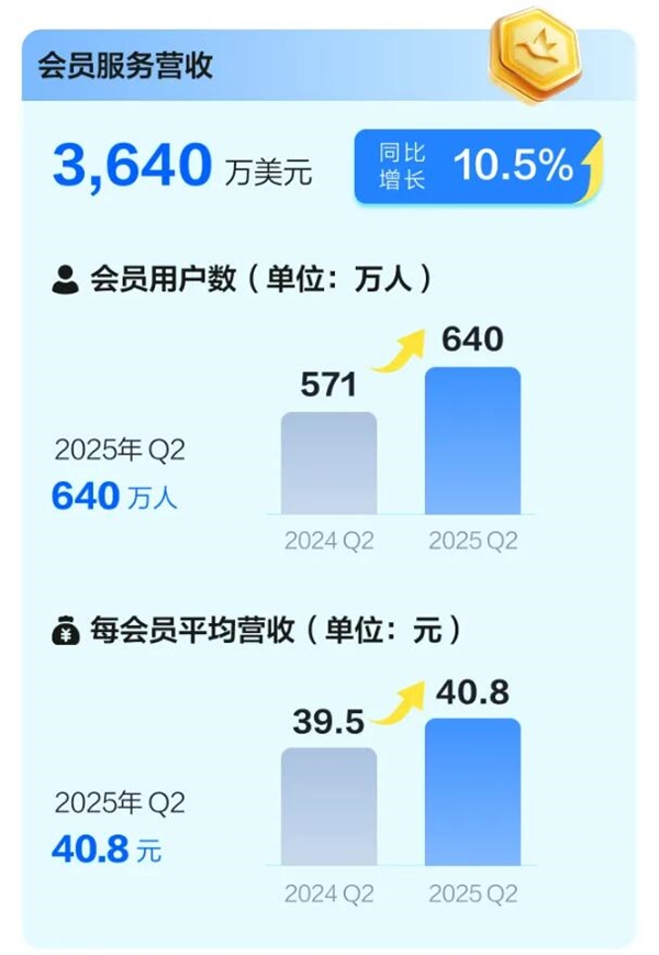 迅雷2025年第二季度会员服务营收为3640万美元,约合2.61亿元人民币,同比增长10.5%。