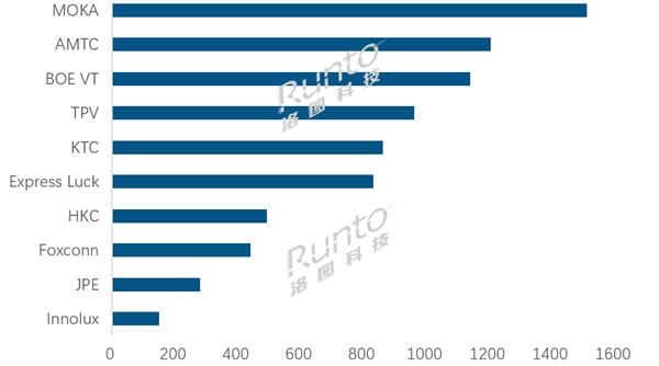 其中,BOE VT(视讯)、TPV(冠捷)、Express Luck(彩迅)和Foxconn(富士康)四家同比增幅均超过10%;而下跌的四家工厂的同比降幅也超过10%。