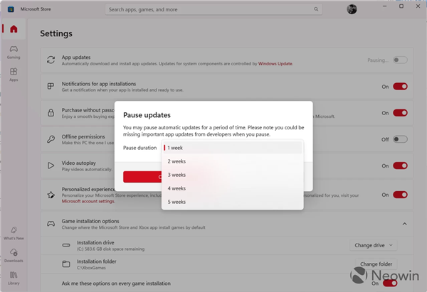 用户目前只可以在微软商店中选择暂停应用更新,暂停更新的时长包括一、二、三、四或五周。