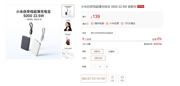 8月20日消息,日前,小米自带线超薄充电宝5000 22.5W发布,将于8月25日10:00开启众筹,众筹价139元。