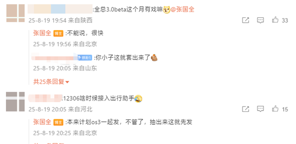 有网友在评论区问到,澎湃OS 3 Beta版是否会在这个月推出,张国全回复称:“不能说,很快”。