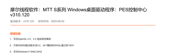 8月20日消息,今日,摩尔线程发布310.120版本显卡驱动程序,带来多项重大技术升级,支持MTT S80、MTT S70显卡。