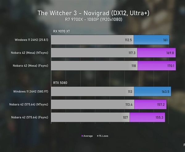 在《巫师3》1080p下,AMD 9070 XT在Linux上的表现略优于Windows,平均帧率达到了170FPS,而Windows上为161FPS;相比之下,RTX 5080在Linux上略有下降,平均帧率约为155-157FPS,低于Windows上的163FPS。