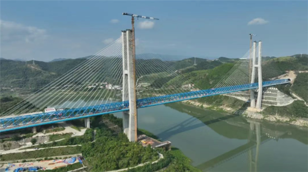 此次合龙的汉江特大桥,是全线控制性工程,位于湖北十堰丹江口水库库区,为梁桁组合结构高铁斜拉桥,全长917.45米,主跨420米,两座主塔高度均达186.5米,一跨飞跃汉江。