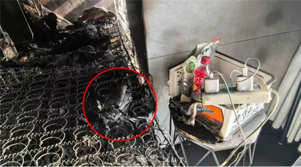 消防员清理火场时发现,起火点位于阁楼房间床头,烧黑的床架上,一个已碳化的充电宝仍连着充电线插在插座上,初步判断火灾是充电宝长时间充电过热,引燃床上物品所致。