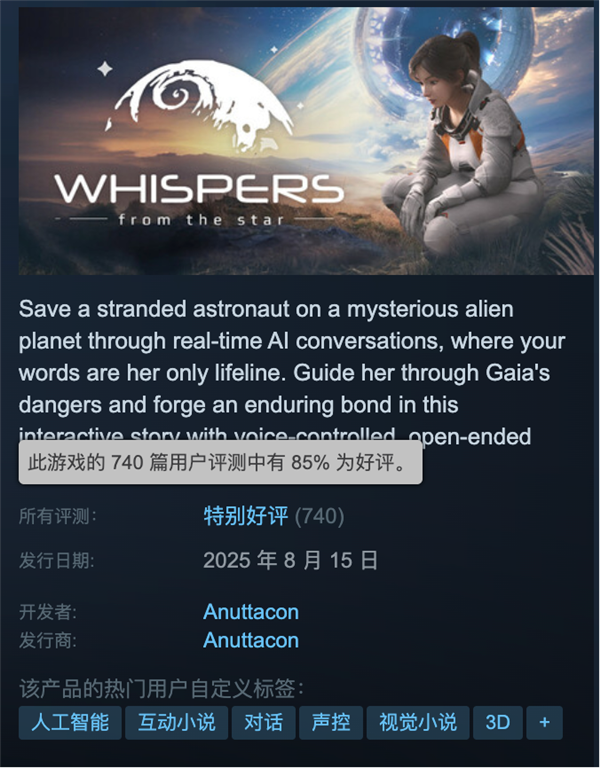 8 月 15 日,原神之父蔡浩宇的新游戏《Whispers from the Star》(下译作《星之低语》)正式在 steam 上线了。