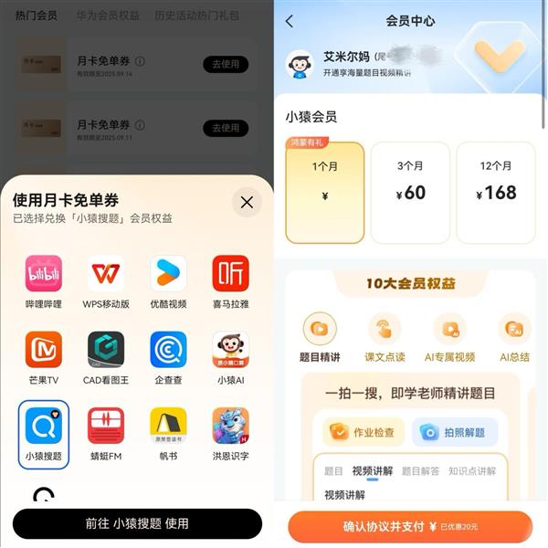 那天给手机升级鸿蒙5.1后,从桌面右滑到负一屏发现了”升级鸿蒙有礼”活动。抱着试试看的心态签到打卡,没想到第三天就抽中了”月卡免单券”,可以用来兑换热门应用app。在兑换列表里看到”小猿搜题”时,我眼睛都亮了——这不就是儿子念叨了半个月的”作业救星”吗?三步操作完成兑换后,我赶紧把正在抓耳挠腮的儿子喊过来:”快试试妈妈的新装备!”