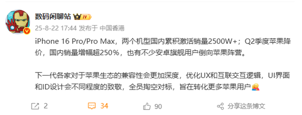 iPhone 16 Pro系列国内销量超2500万 安卓旗舰用户转投苹果