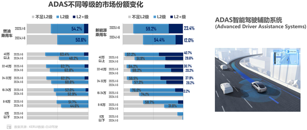报告显示,2025年1-6月,新能源乘用车L2级及以上的辅助驾驶功能装车率达到82.6%,同比去年上半年66.4%大幅增长。