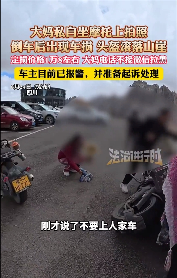 有网友爆料称,自己在旅游时遇到一位大妈,该大妈未经车主允许,擅自坐到其他游客停放在路边的机车上拍照,结果不慎将车弄翻。