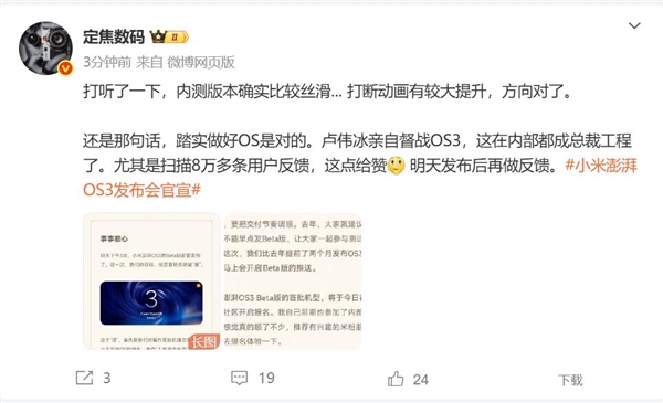 卢伟冰亲自督战小米澎湃OS 3 博主:确实比较丝滑 方向对了