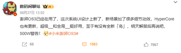 8月28日消息,小米全新一代手机操作系统——小米澎湃OS 3将于今天15:00正式发布,目前已在小米社区开启Beta版招募。