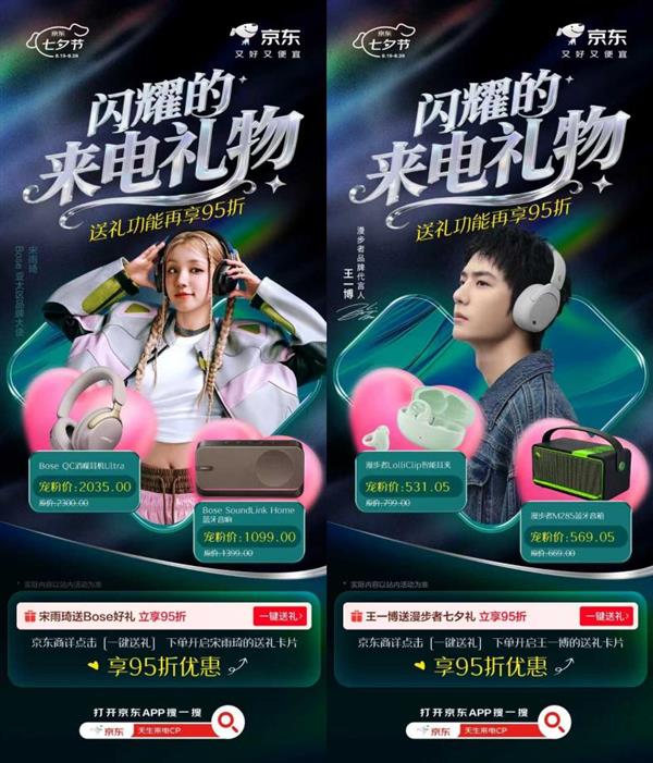 七夕佳节将至,不少用户仍在为挑选一份让爱人心动的礼物而烦恼。近日,京东携手李现、宋雨琦、王一博等多位明星,以及韶音、Bose、漫步者等耳机音箱品牌,特别打造了 “闪耀的来电礼物”活动。活动期间,消费者选购心仪的耳机音箱产品后,在京东商品详情页点击“一键送礼”功能,将礼物分享给心爱的TA,不仅能解锁专属的明星礼物封面,还可享受95折优惠。快打开京东APP搜索“天生来电CP”,为另一半挑选心意好礼吧!