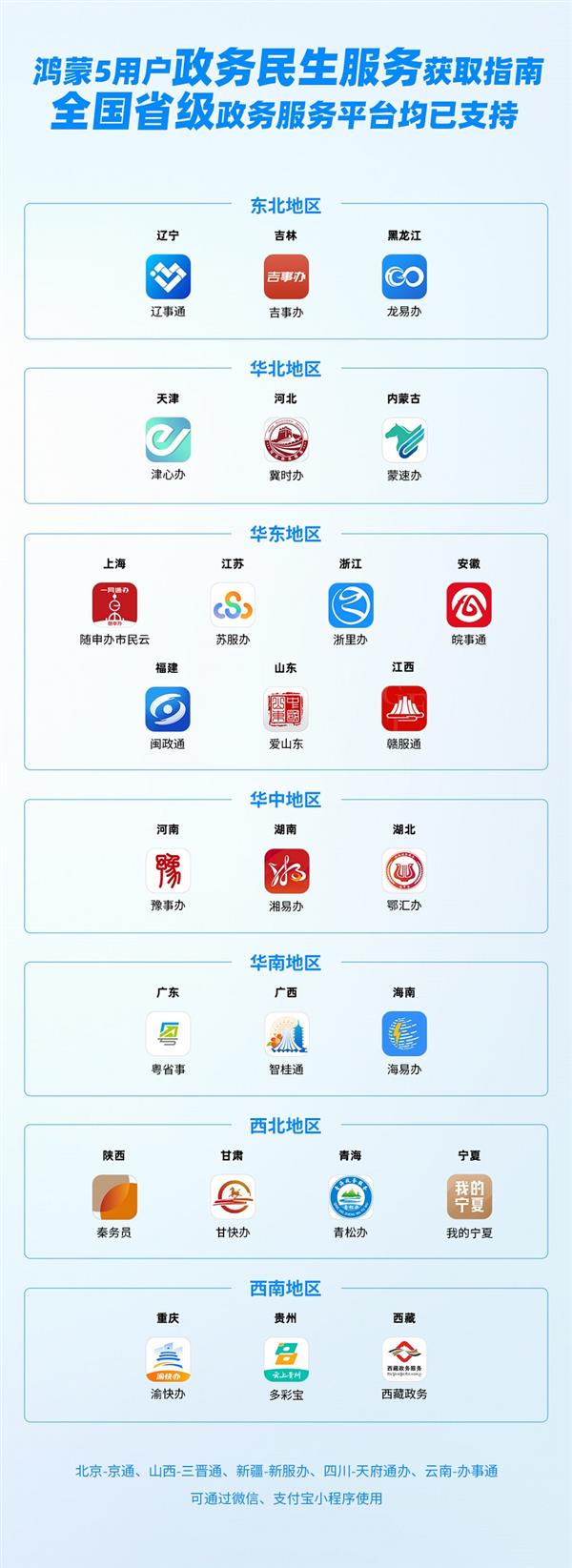 目前,尚有少数省份,如山西“三晋通”、新疆“新服办”、四川“天府通办”、云南“办事通”等平台的鸿蒙版本仍在推进中,用户可以通过微信/支付宝小程序获取政务服务。