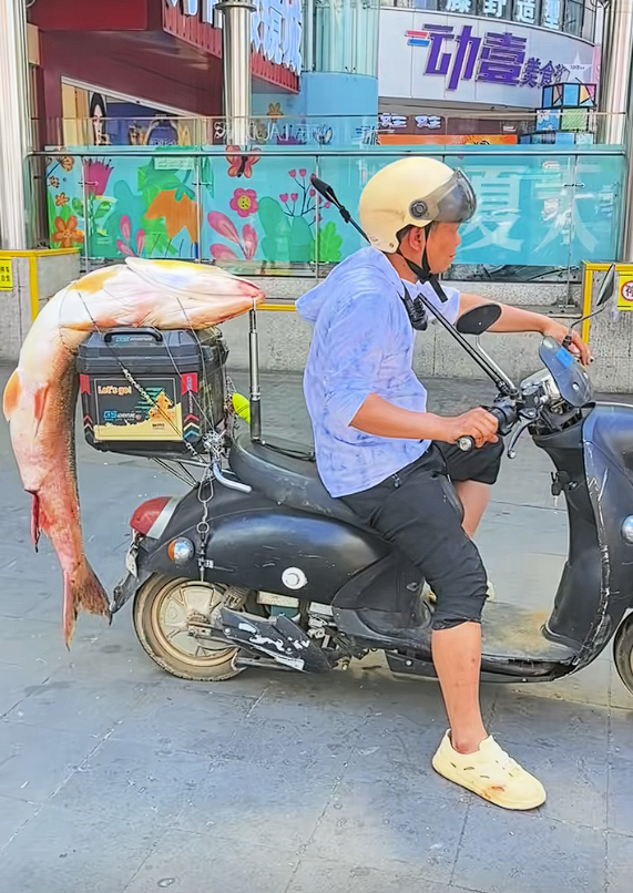 近日,江西南昌一网友发布视频显示,一男子钓到大鱼后,将其挂在电动车后座上,骑着车遛街,吸引了非常多的目光,而男子嘴角的笑容就没下去过。