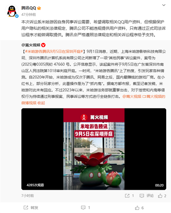 对于被起诉的传言,腾讯QQ今晚进行了回应:“本次诉讼系米哈游因自身民事诉讼需要,希望调取相关QQ用户资料。”
