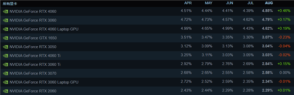 在显卡方面,RTX 4060再次成为玩家的最爱,重回排行榜首位,紧随其后的是RTX 3060和RTX 4060 Laptop。在显卡Top 10中,最大的变化是RTX 4070被RTX 2060挤出了排行榜。